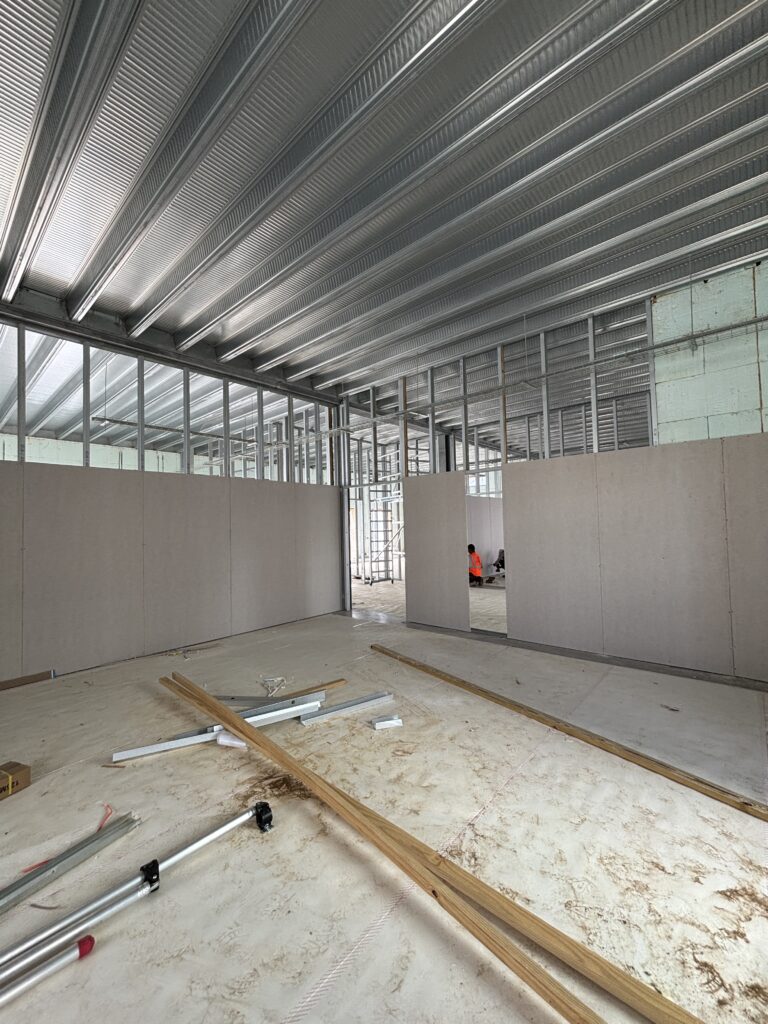 De afgelopen weken is er intensief gewerkt aan de eerste fase van de afbouw. Op zowel de begane grond als de eerste verdieping zijn we bezig geweest met het aanbrengen van de cementdekvloeren en tegelvloeren. Tegelijkertijd zijn de metalstud binnenwanden in uitvoering, waarmee de indeling van de ruimtes steeds zichtbaarder wordt.
